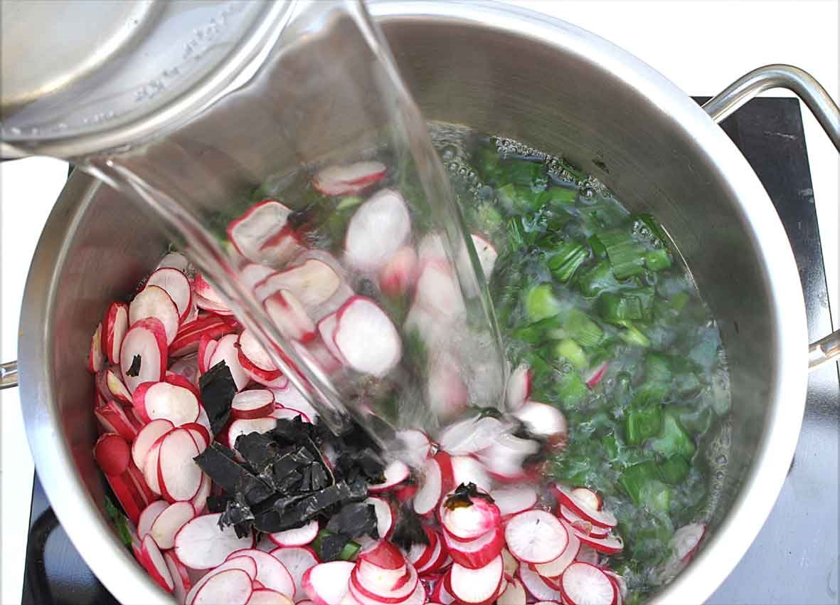 Ingrédients pour 4 à 5 pers.1 botte d'oignons blancs1 botte de radis1 algue wakaméUstensile conseillé 1 marmite inox 20 cm